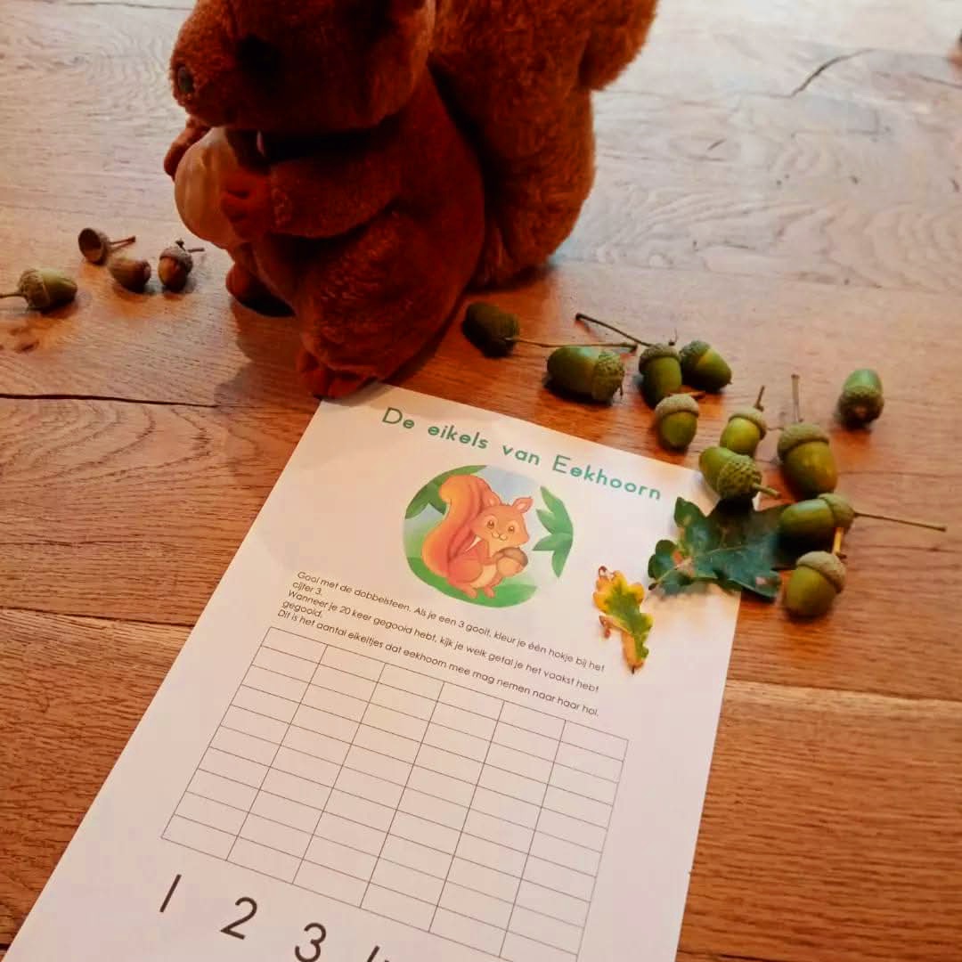 Uitleg: De ene werkt sneller dan de andere leerling. Omdat dit echter een groepsopdracht is, is dit ook een mooie oefening in uitgestelde aandacht en gericht luisteren. In totaal wordt er 20 keer geworpen bij deze activiteit. De bedoeling is om kennis te maken met een staafdiagram en af te kunnen lezen welk aantal ogen het vaakst geworpen is. Voor elke worp vraag ik aan de klas: “Iedereen klaar? Rollen maar!” De leerlingen gooien met de dobbelsteen en kleuren het hokje bij het geworpen aantal. Bij elke worp doe ik een kurk in de bak, zodat zichtbaar is hoe vaak er nog geworpen mag worden. Aan het einde van de twintig worpen kijken we welk getal het vaakst geworpen is bij iedere leerling. Dit is het aantal eikeltjes dat eekhoorn mee mag nemen naar haar hol.