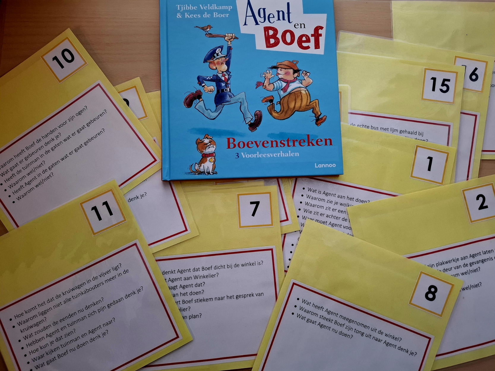 Wat een prachtige uitgave van Agent en Boef. Geschreven door Tjibbe Veldkamp en de sprekende illustraties zijn van de hand van Kees de Boer. Het boek bevat maar liefst drie avonturen: Agent en Boef, Agent en Boef en de tekenstreken & Boevenstreken. Alle verhalen zitten boordevol humor, zowel in tekst als in beeld. Daar moest ik wat mee doen. Ik heb daar een themabak vol met onderwijsactiviteiten bij ontwikkeld, waaronder deze gesprekskaarten. Het boek vind je hier