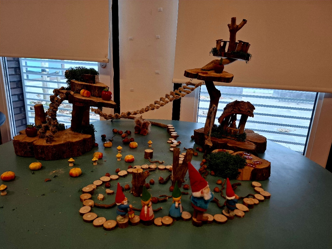 En, misschien wel het allerbelangrijkste: betrek de kinderen bij het inrichten van de themahoek/speeltafel. Doe het samen, geef de kinderen een taak: laat ze bijvoorbeeld herfstschatten zoeken en meenemen naar school. In het kabouterbos hierboven had ik een bergje boomschijfjes neergelegd als manipulatief speelgoed. Eén van de kinderen vroeg me of ze het bos mocht inrichten: ze maakte van de boomschijfjes een prachtig wandelpad voor de kabouters. Ik maak dankbaar gebruik van de fantasie en ideeën van de kinderen.